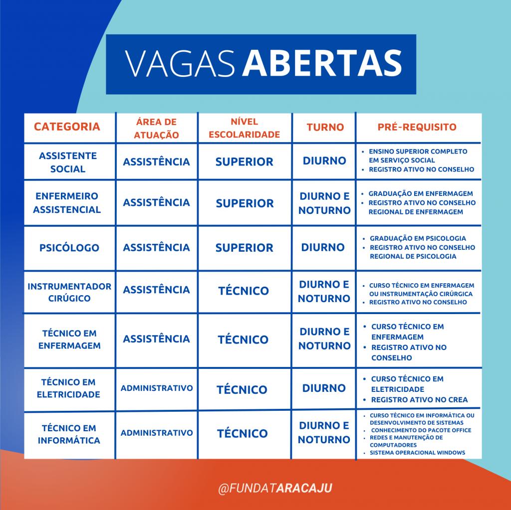 Há vagas para os cargos de assistente social (diurno), psicólogo (diurno) e enfermeiro assistencial (diurno e noturno), as quais têm como requisitos o certificado de conclusão de ensino superior e registro ativo no respectivo conselho de classe.