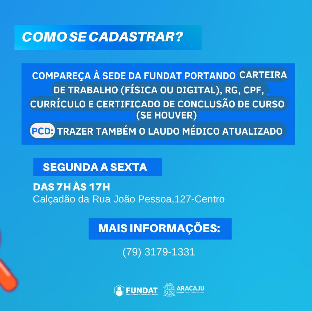 Os interessados devem preencher os pré-requisitos estabelecidos e cadastrar-se ou atualizar o currículo na sede da Fundat, localizada no calçadão da Rua João Pessoa, 127, Centro, portando RG, CPF, certificados de conclusão de curso (se houver) e currículo.