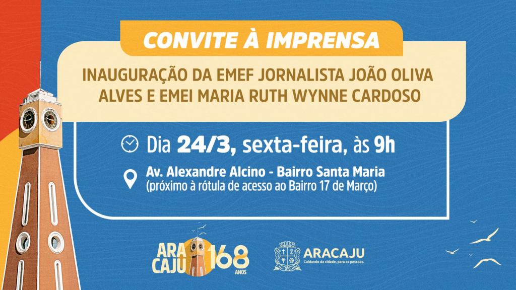 A Prefeitura de Aracaju convida a imprensa para acompanhar a solenidade de inauguração da Escola Municipal de Ensino Fundamental em Tempo Integral Jornalista João Oliva Alves e da Escola Municipal de Educação Infantil em Tempo Integral Maria Ruth Wynne Cardoso, nesta sexta-feira, dia 24, às 9h, no bairro Santa Maria.