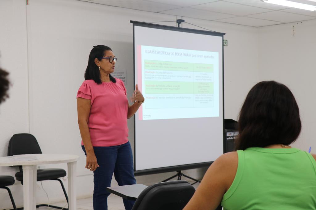A coordenadora de Políticas de Transferência de Renda da Assistência Social, Yolanda de Oliveira, conduziu a reunião e falou sobre a necessidade do alinhamento entre as equipes e passou as orientações sobre as novas condicionalidades.