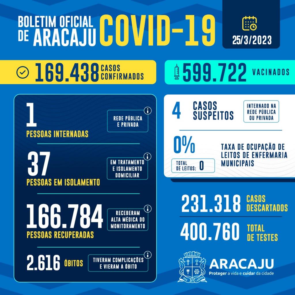 Com isso, 169.438 pessoas foram diagnosticadas com covid-19 em Aracaju. Destas, um está internado em hospital e 37 pacientes em isolamento domiciliar; 166.784 que estavam infectados já estão recuperados e 2.616 foram a óbito.