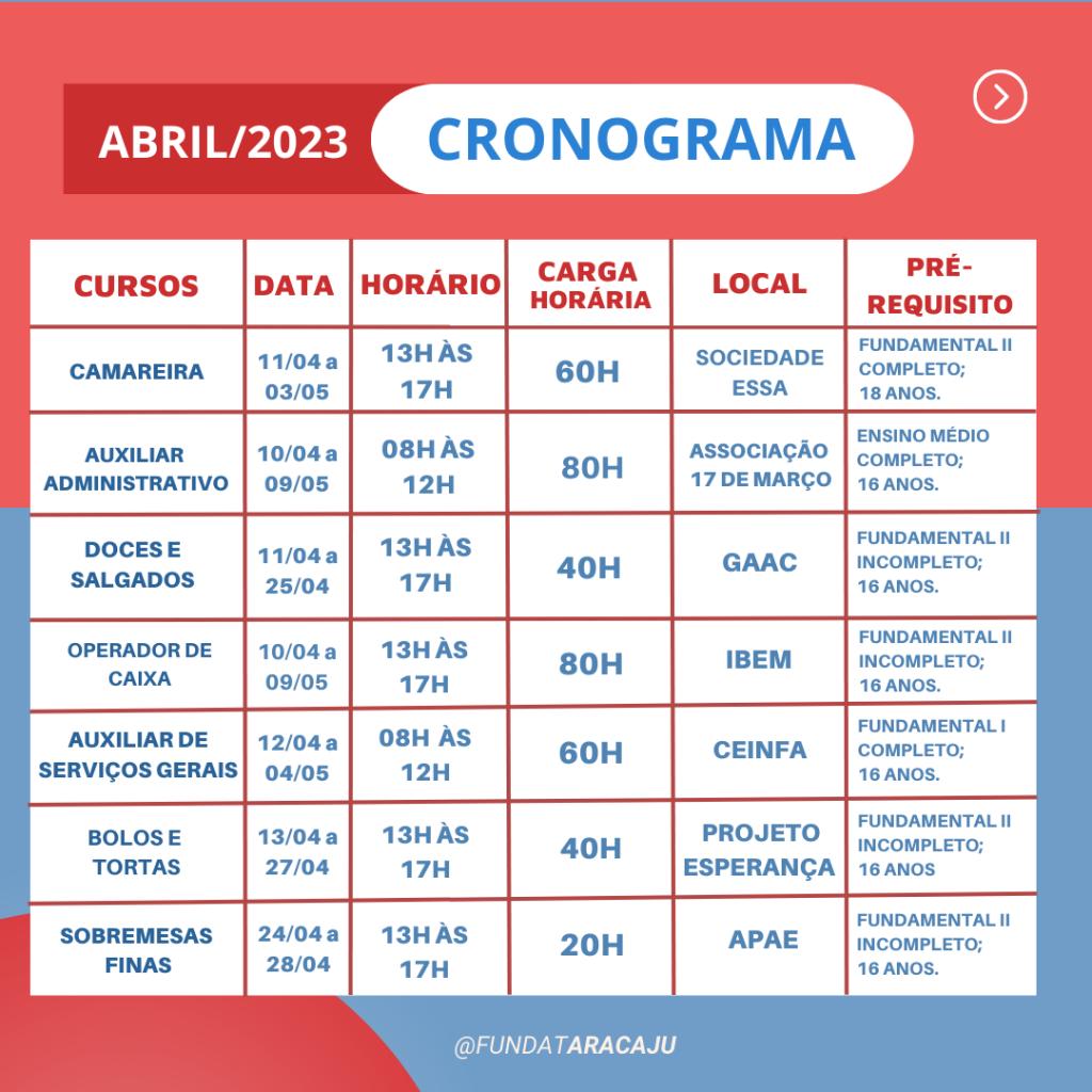 A Prefeitura de Aracaju abrirá, na próxima segunda-feira, dia 3, as inscrições para o preenchimento de 1.650 novas vagas em oficinas e cursos que serão desenvolvidos pela Fundação Municipal de Formação para o Trabalho (Fundat) durante o mês de abril. As vagas estão distribuídas entre 26 oficinas online e cursos de qualificação para o mercado de trabalho. Desta vez, serão 14 novas turmas presenciais e 12 na modalidade online, para pessoas com idade partir dos 16 anos.