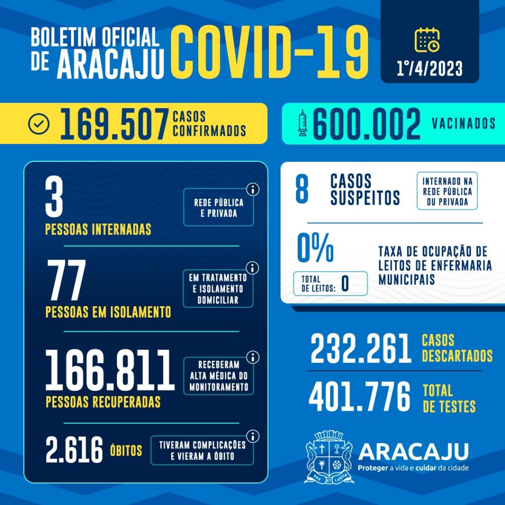 Com isso, 169.507 pessoas foram diagnosticadas com covid-19 em Aracaju. Destas, três estão internadas em hospital e 77 pacientes em isolamento domiciliar; 166.811 que estavam infectados já estão recuperados e 2.616 foram a óbito.
