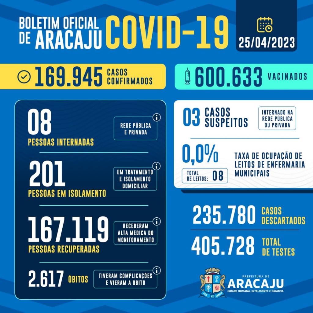 Com isso, 169.945 pessoas foram diagnosticadas com covid-19 em Aracaju. Destas, 8 estão internados em hospital e 201 pacientes em isolamento domiciliar; 167.119 que estavam infectados já estão recuperados e 2.617 foram a óbito.