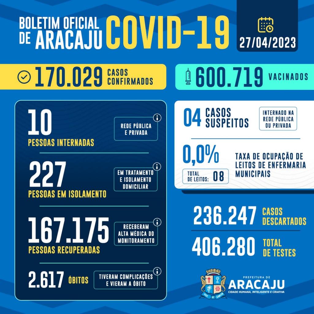 Com isso, 170.029 pessoas foram diagnosticadas com covid-19 em Aracaju. Destas, 10 estão internados em hospital e 227 pacientes em isolamento domiciliar; 167.175 que estavam infectados já estão recuperados e 2.617 vforam a óbito.